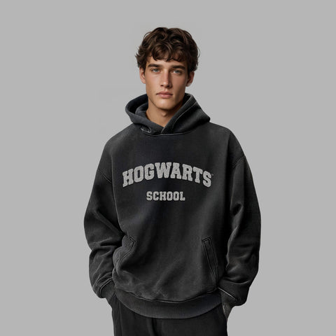 「Hogwarts School Hoodie」は、クラシックな大学スウェットを彷彿とさせるカレッジ風フロントグラフィックが印象的。ウォッシュドグレーの刺繍で表現された“HOGWARTS SCHOOL”の文字が、モノトーンながらも力強い存在感を放ちます。